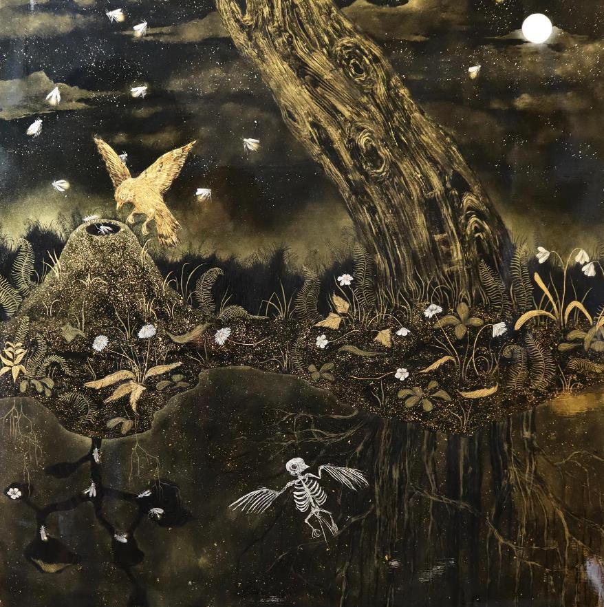 T: The main techniques I use are lacquer work and gilding. My process begins with a gessoed board, onto which I build up 25-30 layers of black lacquer to create a shiny, black mirrored surface. I then gild images on top of this surface and paint them with layers of shade and line before polishing them and sealing with shellac. Occasionally, I incorporate shell inlays into my work, and I have also explored a technique called Coromandel, where the lacquer is carved to reveal the gesso underneath, which is then dyed, leaving a colourful carved image surrounded by black lacquer.