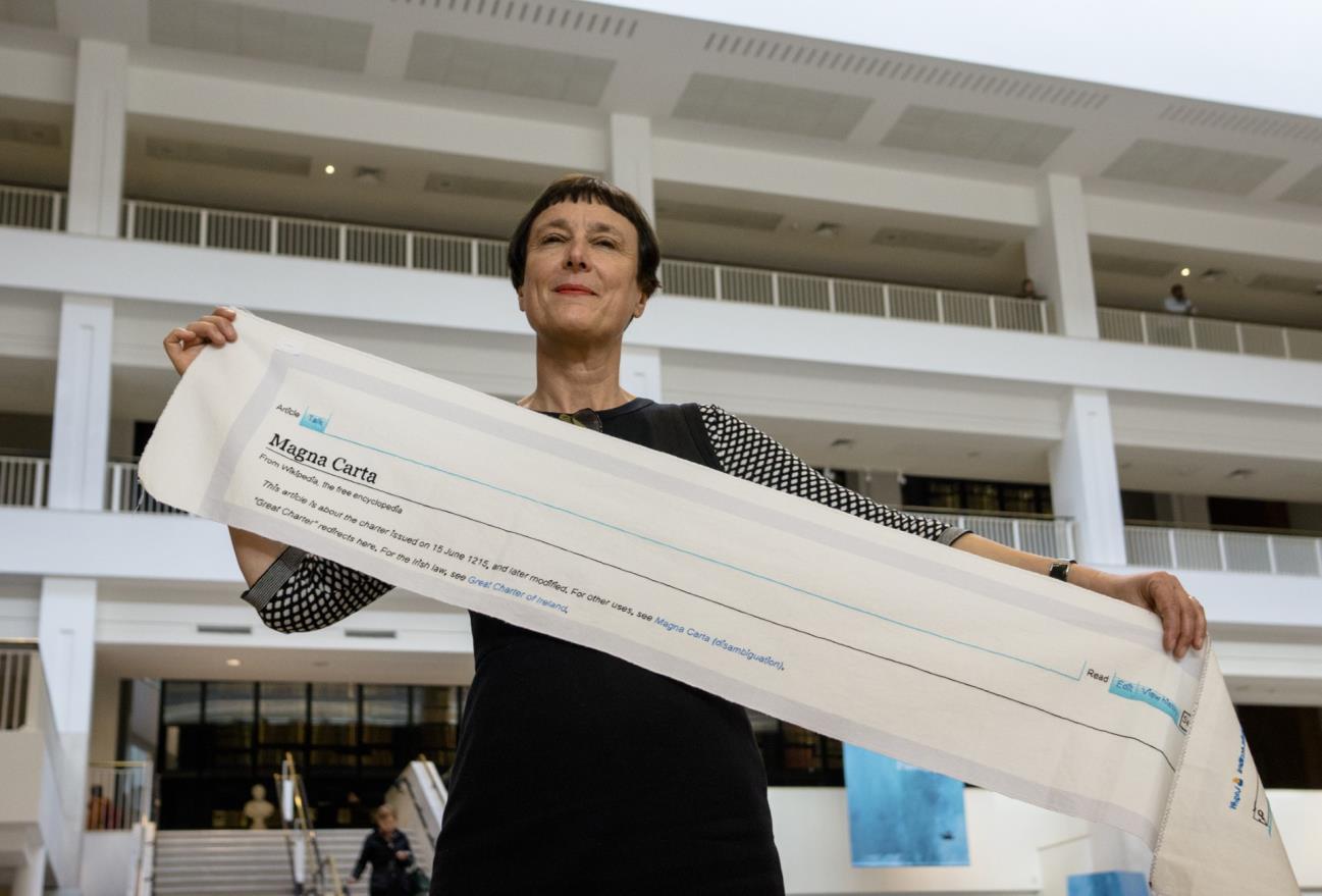 Cornelia Parker’s Magna Carta is a 13-metre-long embroidery of the Magna Carta’s Wikipedia page that Fine Cell Work had the privilege of working on. I worked on the project from the beginning. Cornelia wanted to use a number of stitchers on the project to mirror the Wikipedia’s entry on the Magna Carta which was the work of many hands She wanted to involve people who had been deprived of their liberty in her artwork about a charter defining civil liberties. 36 different stitchers across 13 prisons contributed to the artwork, along with over 200 other stitchers from varying backgrounds Each stitcher left their mark to create a very 21stcentury crowd-stitched Magna Carta.I stitched the words ‘New Zealand’ on the piece. Cornelia has since commissioned FCW to stitch her artworks.