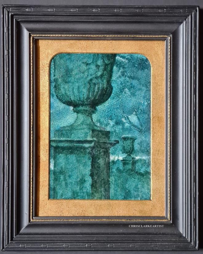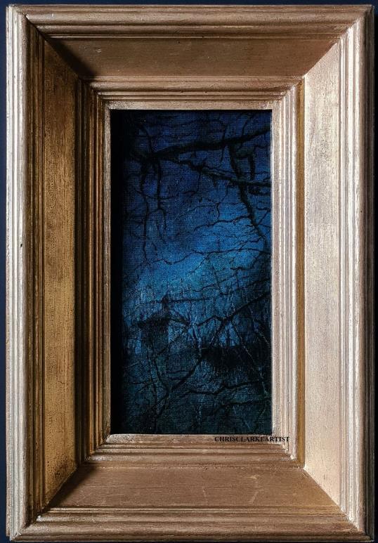 Chris’ works are small, exquisitely fabricated and technically painted landscapes and still life pieces. Whereas many artists might sell themselves short, by framing their pieces in an uninspiring frame, Chris takes into account every aspect of his creations, regarding the painting, frame, mount, backing and glazing as an art object with a jewel like quality The overall presentation of Chris’ work is integral to his creation of an experience for the viewer- a dreamlike encounter with childhood memories which read as a love letter to the English countryside and architecture, sculpture and wildlife that is quintessentially British.