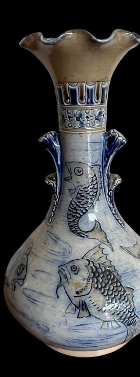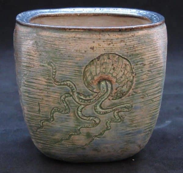 The final popular category is the gourd vase (image below), which were usually the work of Edwin and Walter Martin and perfectly illustrate their skills as master potters. Nips, veins, and bumps were often added to the clay to mirror decorative effects found in nature This, coupled with the brothers’ trademark muted palette, put their wares at the forefront of the emerging Victorian Arts and Crafts movement.