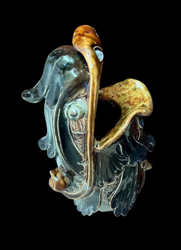 The second common style of Martinware is the grotesque form, another lifelong obsession for Robert Wallace, established during his time working with J.B. Phillips and based on the gargoyles and Gothic features of medieval architecture.