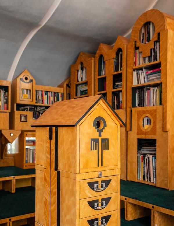The Architectural Library with the slide-scraper in the foreground, an ad-hoc combination of off the shelf filing cabinets with added MDF ornamentation. Photograph by Sue Barr.