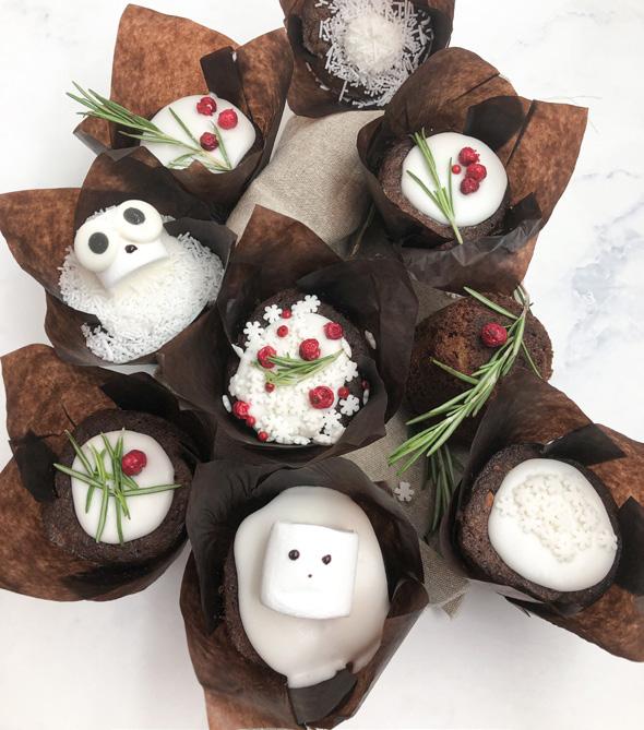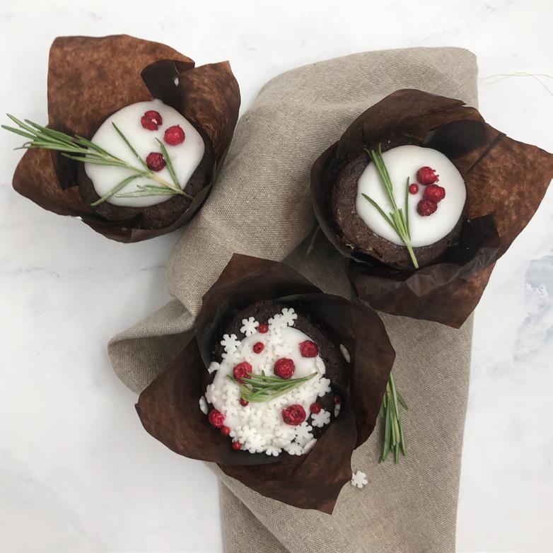Samme opskrift kan hældes i muffinforme. Dejen hæver ikke op, som en almindelig muffin, derfor er der rig mulighed for at pynte dem i vinter-, eller julestil. Her har vi pyntet med hvid frosting, hvid krymmel (308510), hvide sukker snefnug (304322) og skumfiduser (774544).