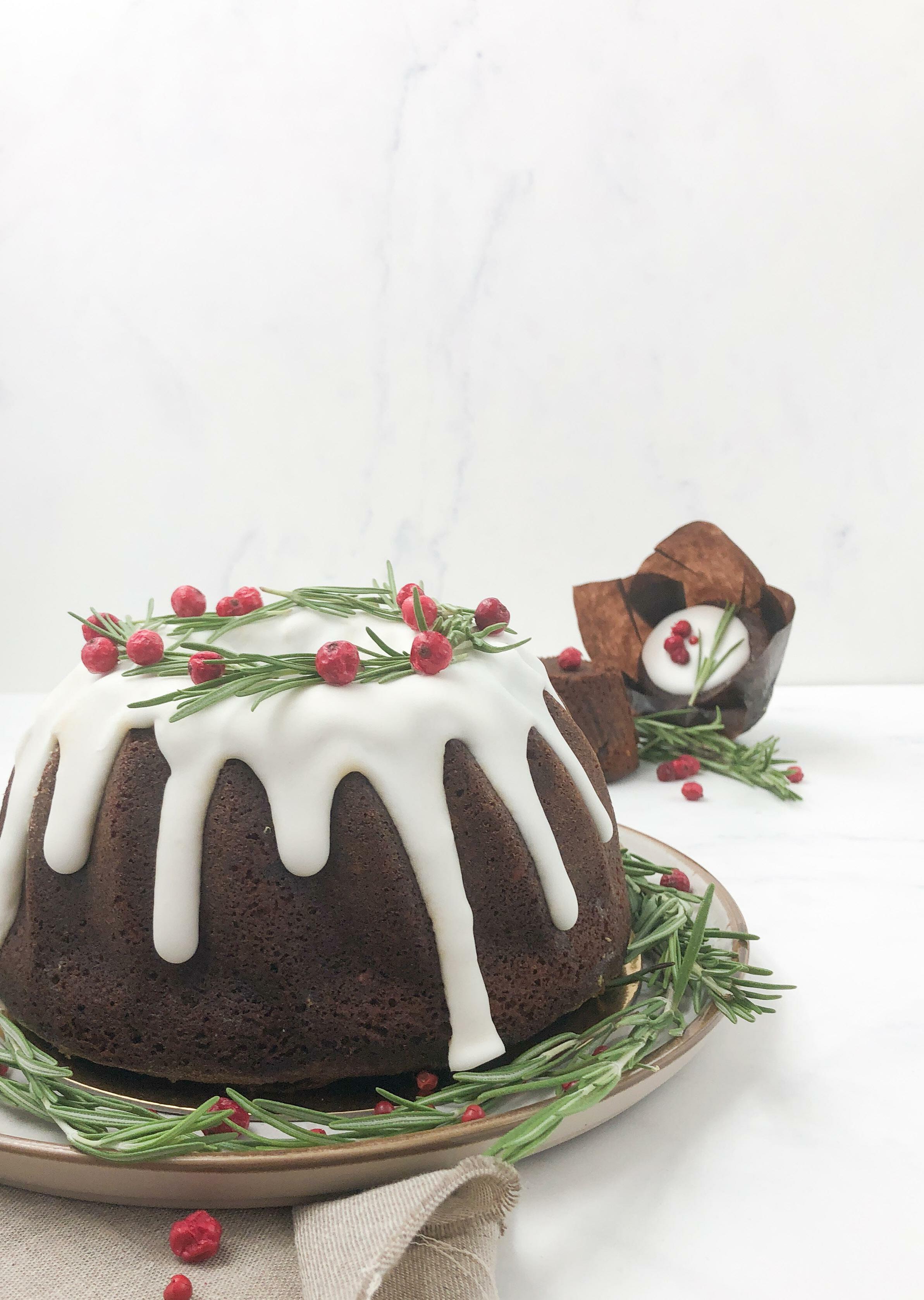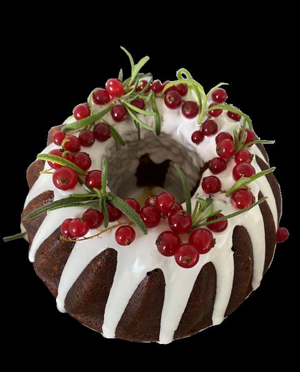 Lækker Appelsin og krydderkage tilsat lidt tranebær og pyntet med hvid frosting, ribs og rosmarin. Opskrift til 1 kage.