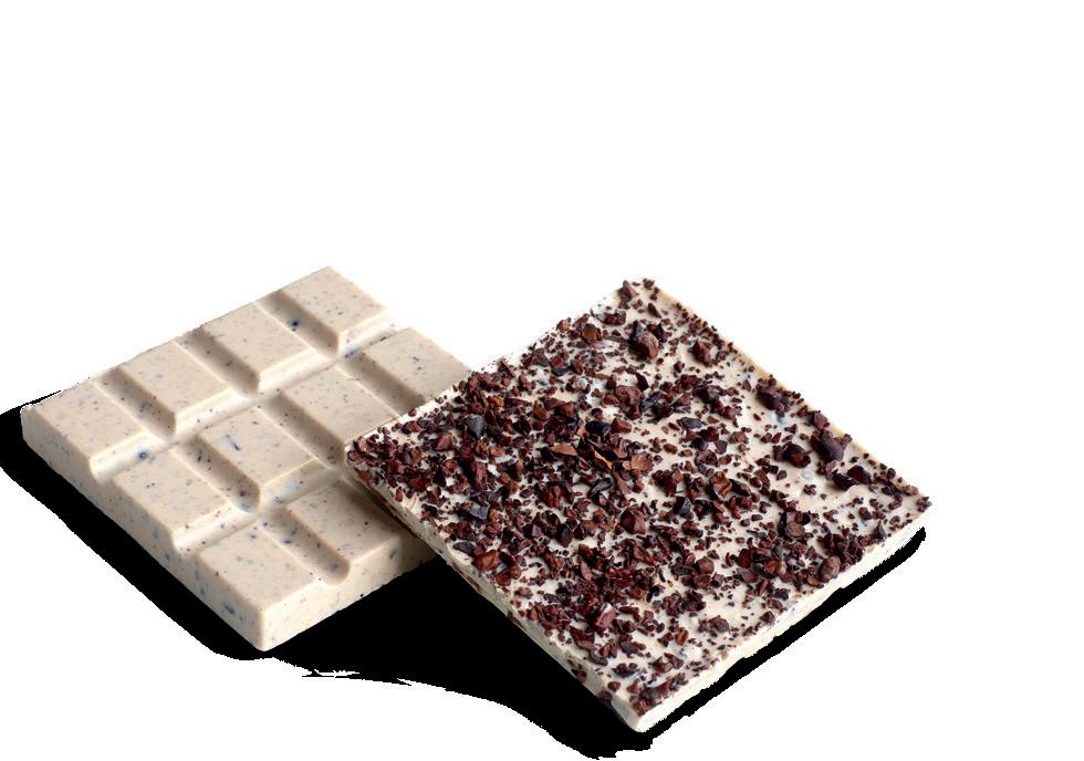 Toppingen fordeles omgående over chokoladen. Lad chokoladen krystallisere i ca. 60 min ved 20°C deles og pakkes.