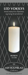 115454115455 LED LYS & FJERNBETJENING ASP HOLMBLAD Varenr. Beskrivelse Farve Størrelse Indhold pr. krt. 122753 LED kronelys Hvid 2,3 × 23 cm 12 × 2 stk. 122754 LED bloklys Hvid 5 × 5,7 cm 6 stk 122755 LED bloklys Hvid 5,8 × 13 cm 6 stk 122756 LED bloklys Hvid 6,8 × 15 cm 6 stk 122757 LED bloklys Hvid 7,8 × 18 cm 6 stk 122752 Fjernbetjening 1 stk. 122753 122754 122755 122756 122757 122752 Asp-Holmblad LED lys brænder med meget autentisk flamme Kronelys anvender 2 x AAA batterier og brænder ca. 120 timer Bloklys anvender 2 x AA batterier og brænder ca. 400 timer. Alle ASP-Holmblad LED lys anvender den samme fjern betjening som købes separat. Fjernbetjeningen leveres med batteri. Med denne fjernbetjening kan du tænde og slukke alle dine Asp-Holmblad LED lys på samme tidvarenr. 122752. LED LYS Hvide og røde LED lys Lysene leveres med 1 stk. fjernbetjening. Sorte LED lys Lysene leveres med med 6 timers timer. (Fås ikke med fjernbetjening) 122701-1 122702-1 122703-1 122704-1