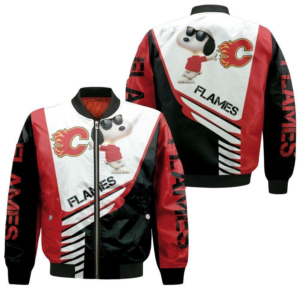 Introducing the Calgary Flames Snoopy For Fans Bomber Jacket, a must-have for any devoted hockey fan! This exclusive collaboration brings together the beloved Snoopy character with your favorite NHL team, the Calgary Flames. Made with premium materials, this bomber jacket is designed to keep you warm and stylish during those intense game nights.
