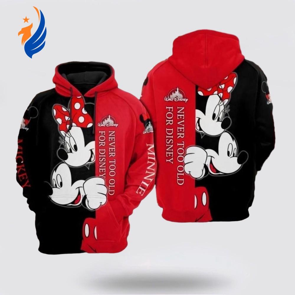 Don't miss out on the opportunity to own this unique piece of Disney merchandise. Grab your Mickey and Minnie Mouse Never Too Old for Disney All Over Printed 3D Hoodie today and let the enchantment of Disney accompany you wherever you go!