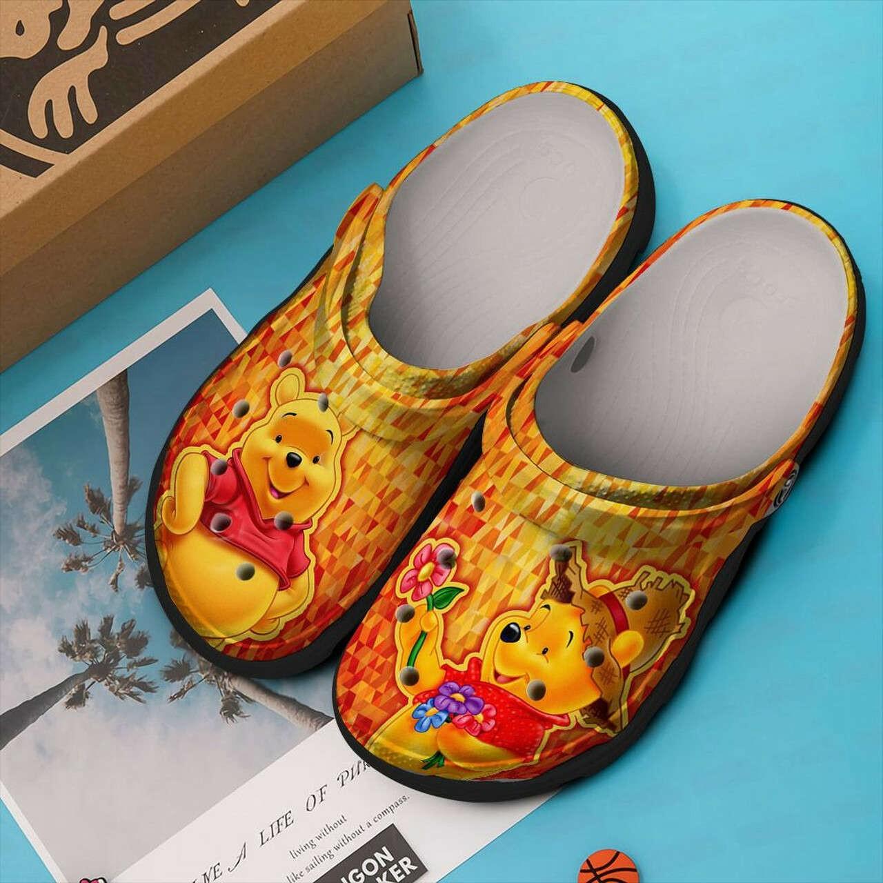 What sets these clogs apart is the delightful Winnie The Pooh design. With his iconic red shirt and honey pot, Pooh is beautifully showcased on the upper, exuding charm and nostalgia. Whether you're strolling through the park or running errands, these clogs will bring a smile to your face and spark conversations wherever you go.