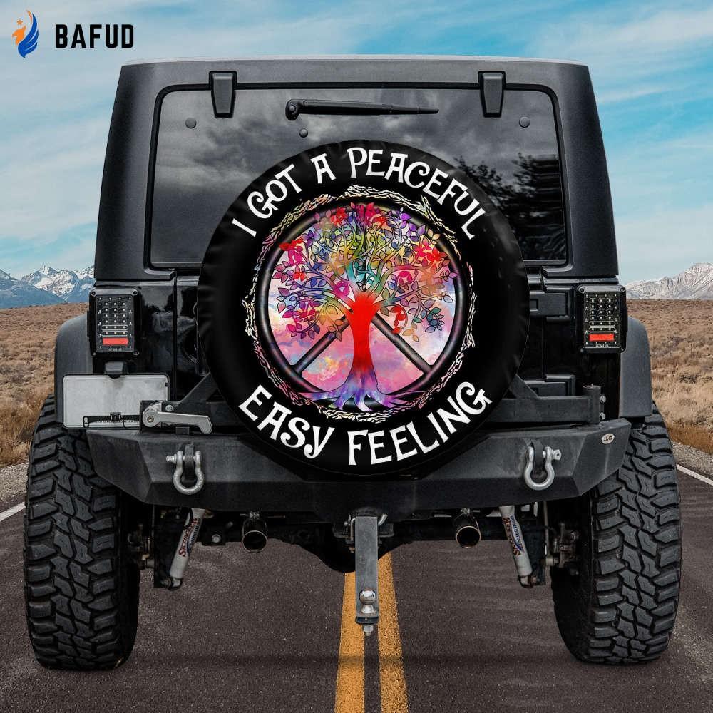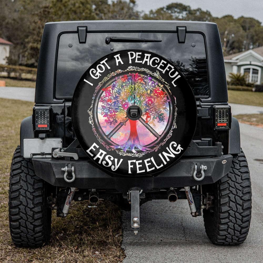 Introducing the "I Got A Peaceful Easy Feeling" Spare Tire Cover, the perfect accessory to add a touch of peace and boho vibes to your vehicle. Whether you choose the version with or without a camera hole, this tire cover is designed to bring a sense of tranquility on your journeys.