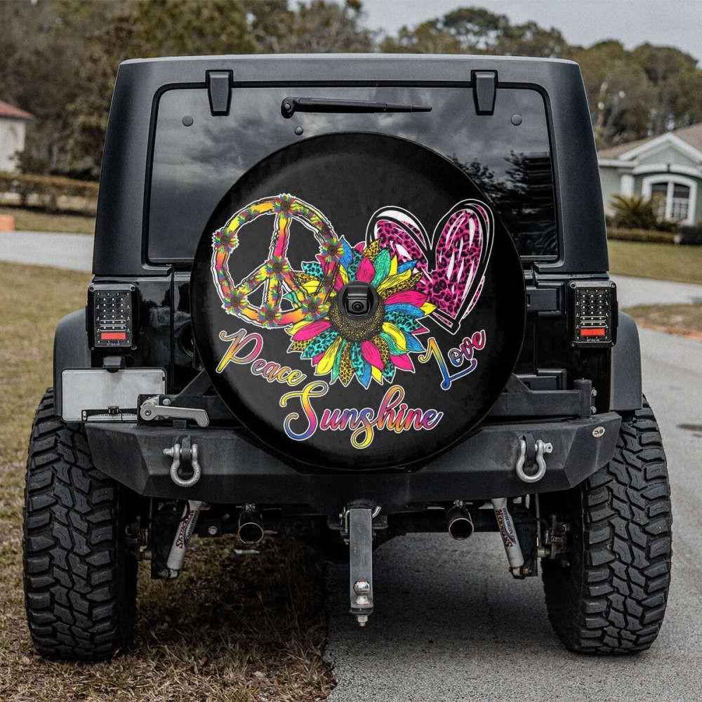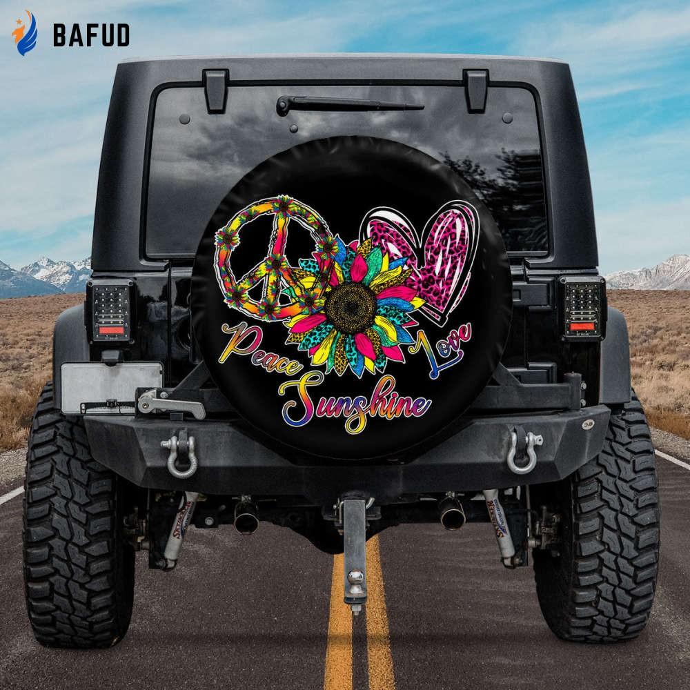 Invest in our Peace Love Sunshine Spare Tire Cover today and enjoy the value it brings to your vehicle. Express your love for peace, showcase your personal style, and protect your spare tire in the most fashionable way possible.