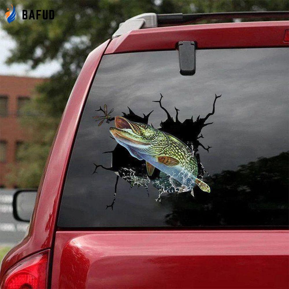 Pike Fishing Cracked Car Decal Sticker - Waterproof - PVC Vinyl. Manufactured with full-color printed vinyl, sun-resistant