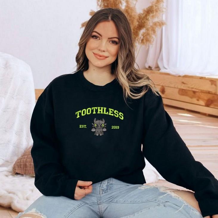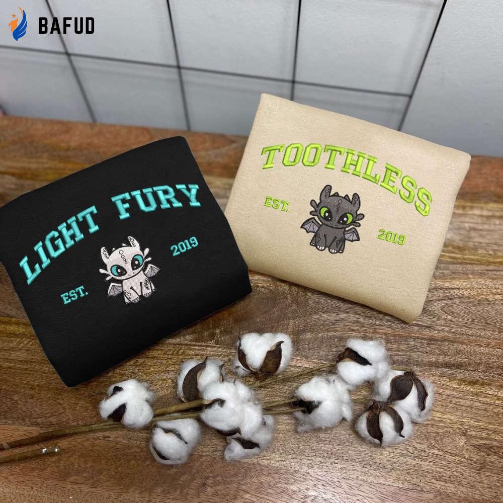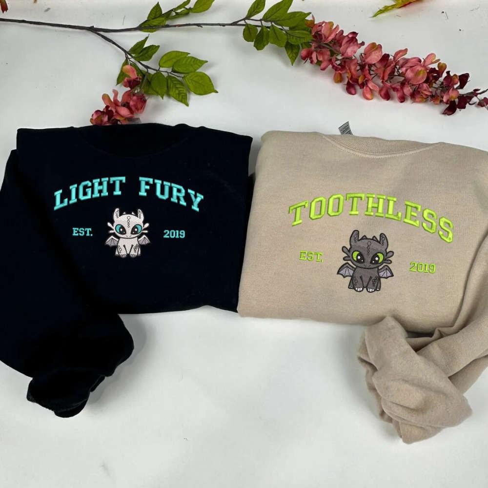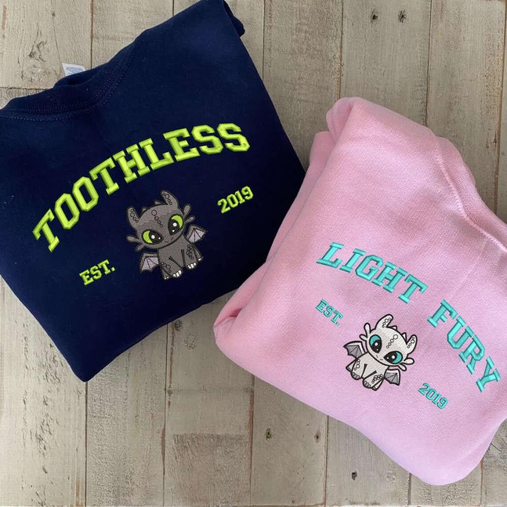 Introducing our Toothless and Light Fury Embroidered Sweatshirt, the perfect addition to any How To Train Your Dragon fan's wardrobe! This Dragon's Couple Shirt EH361-362 is designed to celebrate love and friendship, featuring the adorable Toothless and Light Fury couple. Made from premium quality materials, this sweatshirt guarantees ultimate comfort and durability. The intricate embroidery adds a touch of elegance and uniqueness to the design. Whether you are a fan of the movie or simply love dragons, this Valentine Shirt EH361-362 is a must-have. Show your love for dragons and each other with this Couple Shirt EH361-362, making it an ideal gift for your partner. With its trendy design, outstanding quality, and captivating details, our Toothless and Light Fury Embroidered Sweatshirt is the ultimate choice for any dragon enthusiast. Upgrade your style and embrace the magic of dragons today!