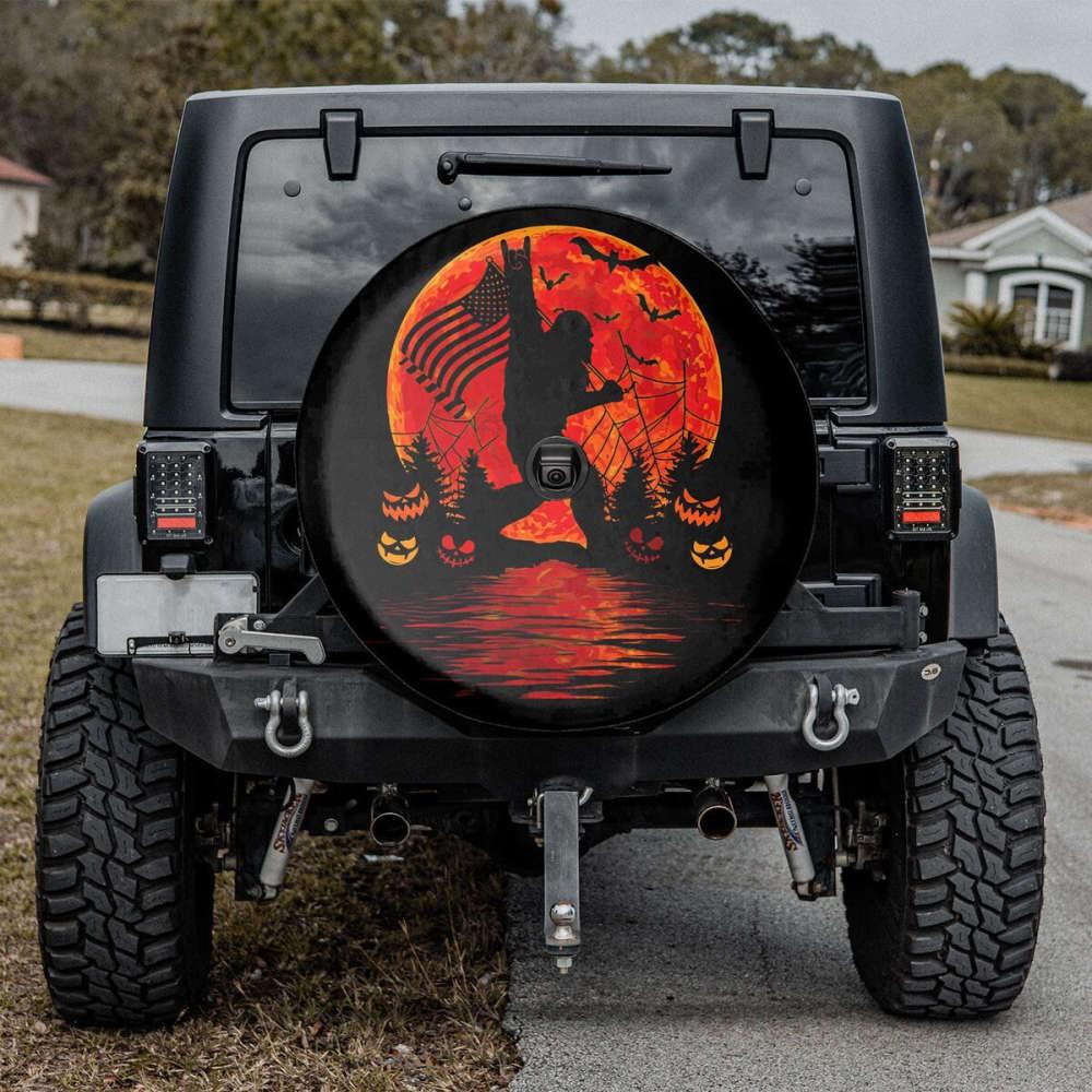 Introducing our Sasquatch With American Flag And Peace Sign Halloween Spare Tire Cover, the perfect accessory to showcase your love for both your country and the spooky season! This custom tire cover is designed with meticulous attention to detail, featuring a vibrant American flag and a peace sign embellished with iconic Halloween elements.