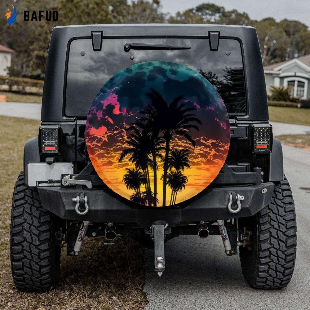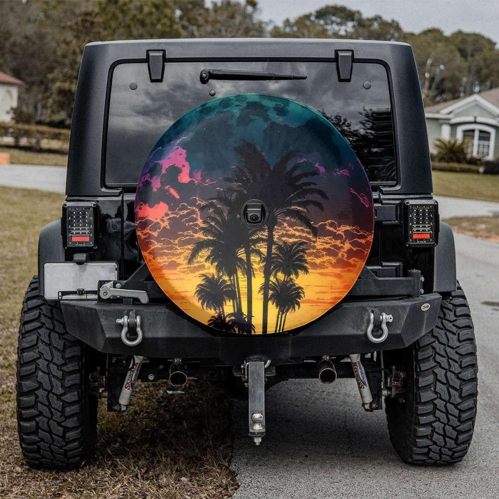 The Palm Moon Spare Tire Cover is the ultimate accessory for your vehicle, combining style and functionality. Made from highquality materials, it ensures durability and protection for your spare tire. The unique sun and moon design adds a touch of celestial beauty to your camper or SUV, making it stand out from the crowd. With its easy installation process, you can effortlessly secure it to your spare wheel. The camera hole feature allows you to capture scenic views without removing the cover.
