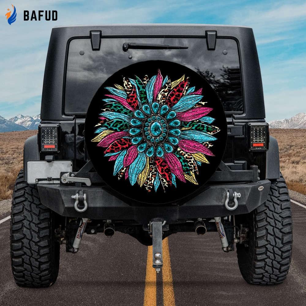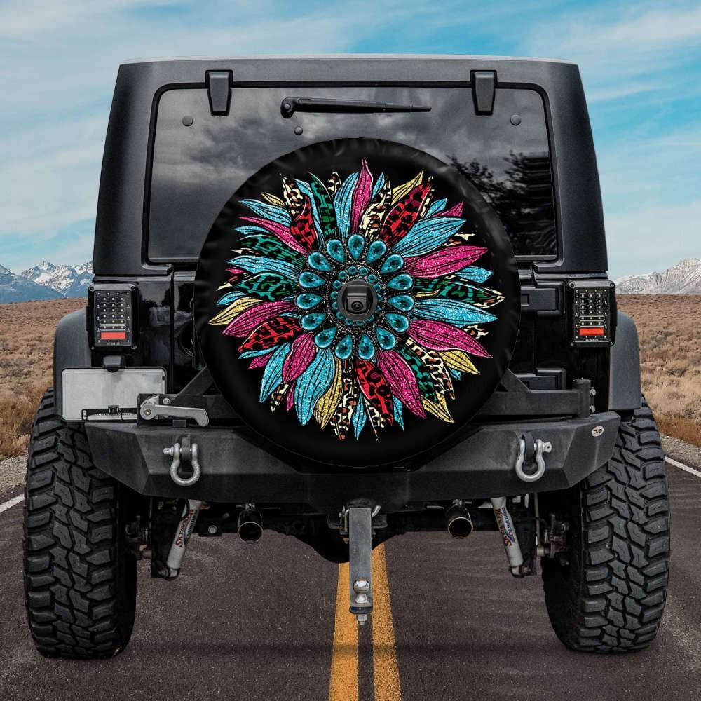 Featuring a stunning sunflower pattern, this tire cover is sure to turn heads wherever you go. The vibrant pink color and turquoise gemstone accents exude an irresistible allure, making your vehicle stand out from the crowd.