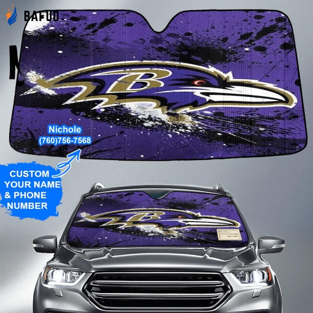 Featuring the iconic Baltimore Ravens logo prominently displayed, this sunshade is a must-have for any true fan. But that's not all – you can personalize it with your name and phone number, making it uniquely yours. Now, your love for the Ravens can shine even brighter!
