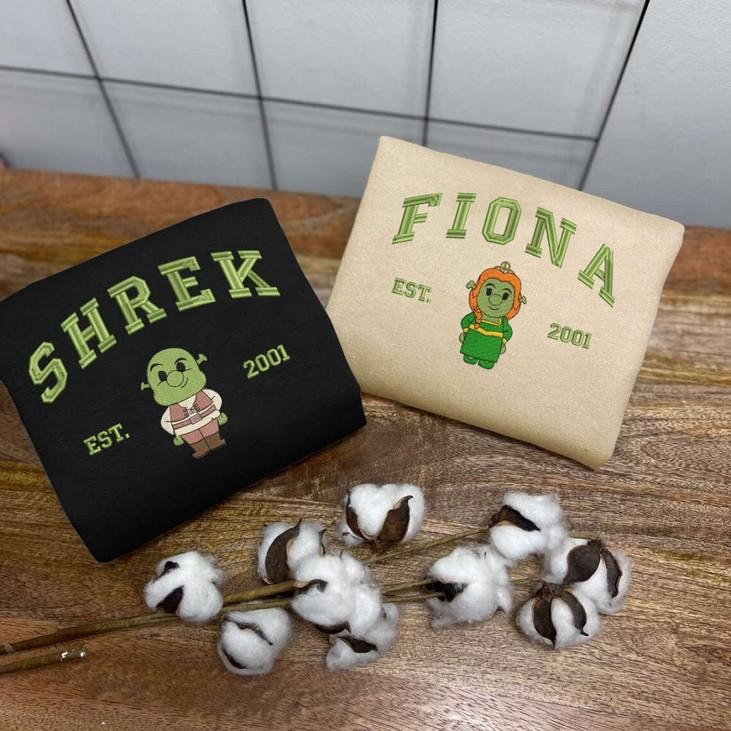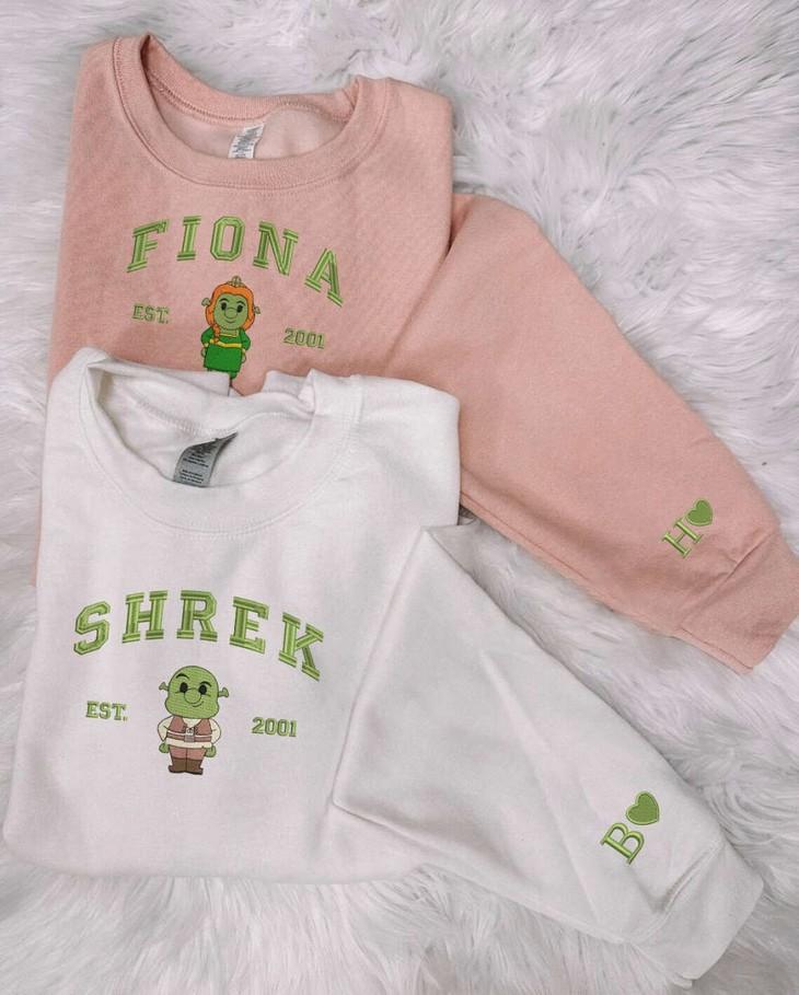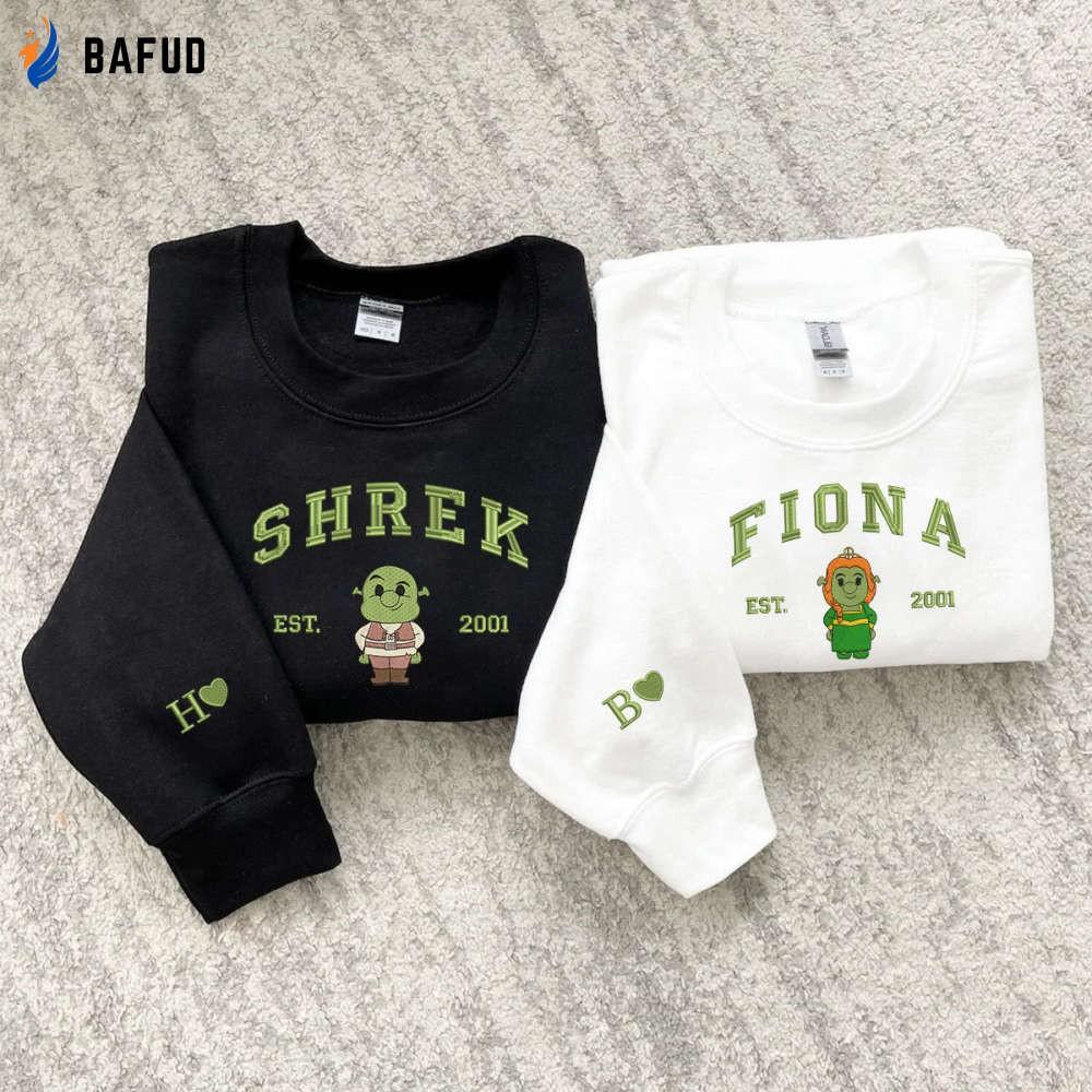 Get ready to embrace your inner ogre with the Shrek and Fiona Couple Embroidered Sweater. This adorable cartoon couple shirt is the perfect Valentine's gift for him, offering both comfort and style. Made with high-quality materials, this trending crewneck will keep you warm and cozy all day long. The detailed embroidery of Shrek and Fiona adds a touch of whimsy and nostalgia to your outfit. Whether you're a fan of the movie or just looking for a unique and fun piece, this sweater is a must-have addition to your wardrobe. Show off your love for Shrek and Fiona with this one-of-a-kind shirt and enjoy the smiles it brings wherever you go.