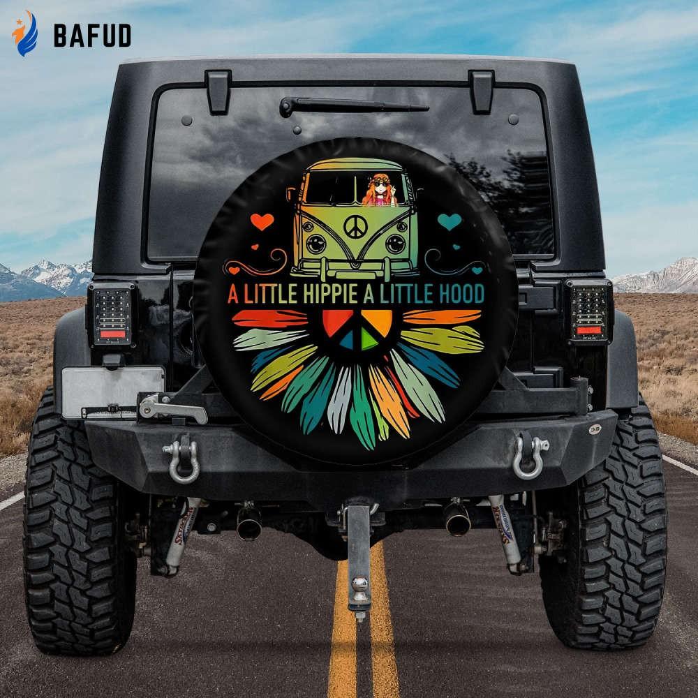 Featuring a vibrant peace sign flowers design, this tire cover is a true eye-catcher. The colorful pattern adds a pop of color and personality to your vehicle, making it stand out from the crowd. Made from high-quality materials, it is durable and weatherresistant, ensuring long-lasting use even in harsh conditions. Not only does this tire cover serve as a stylish car decor, but it also offers practical benefits. It safeguards your spare tire from dirt, dust, and harmful UV rays, preventing premature aging and potential damage. With easy installation and a secure fit, it stays in place during your daily adventures, providing peace of mind. Value is at the core of this product, as it combines both style and functionality. It allows you to express your individuality and love for all things hippie and hood, while also protecting your spare tire investment. So, hit the road with confidence and let your car reflect your unique personality with the A Little Hippie A Little Hood Spare Tire Cover.