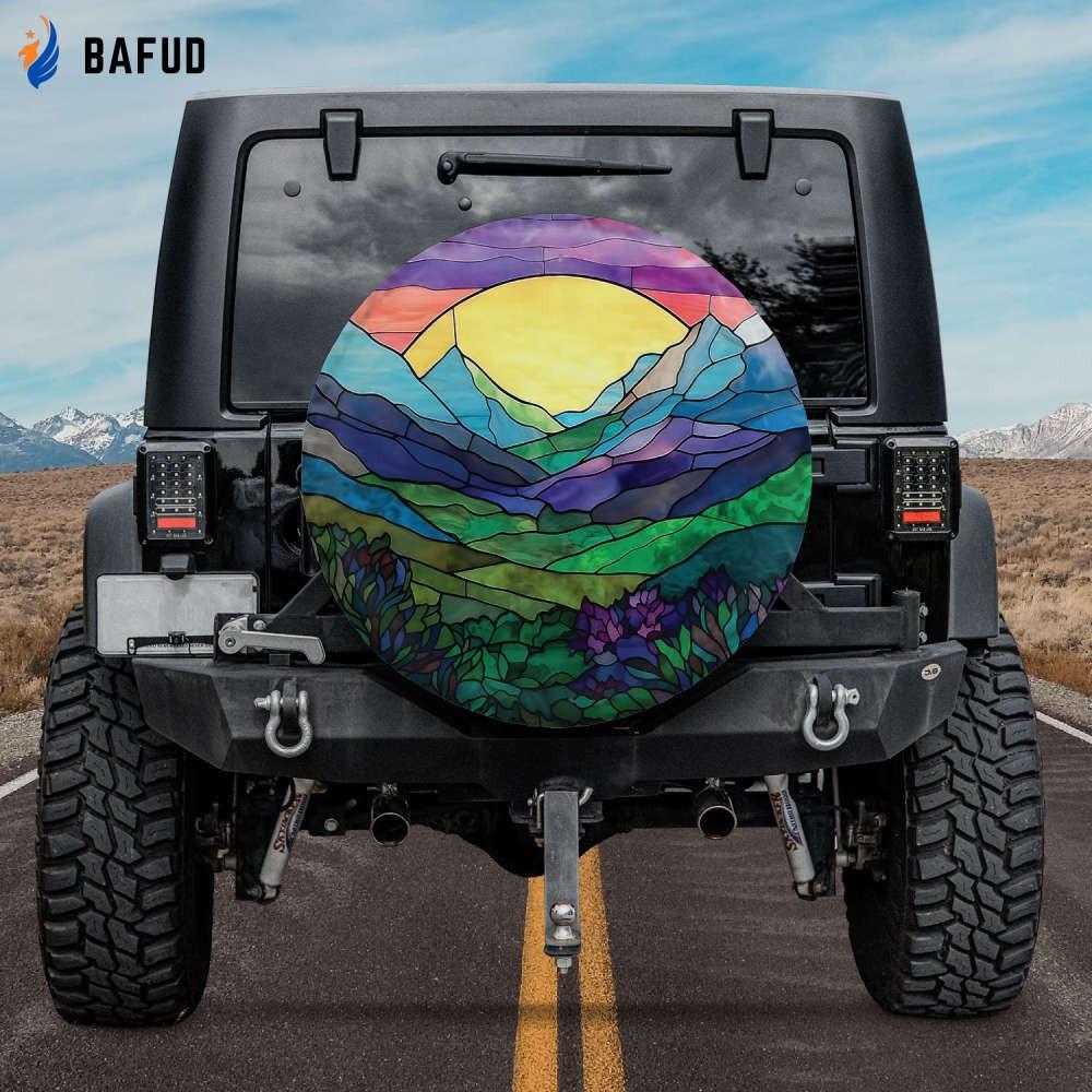Introducing our Colorful Stained Glass Mountain Valley With A Vibrant Sunset Spare Tire Cover, the perfect gift for car lovers and RV SUV owners. Transform your vehicle into a mesmerizing work of art with this stunning piece of car accessory.