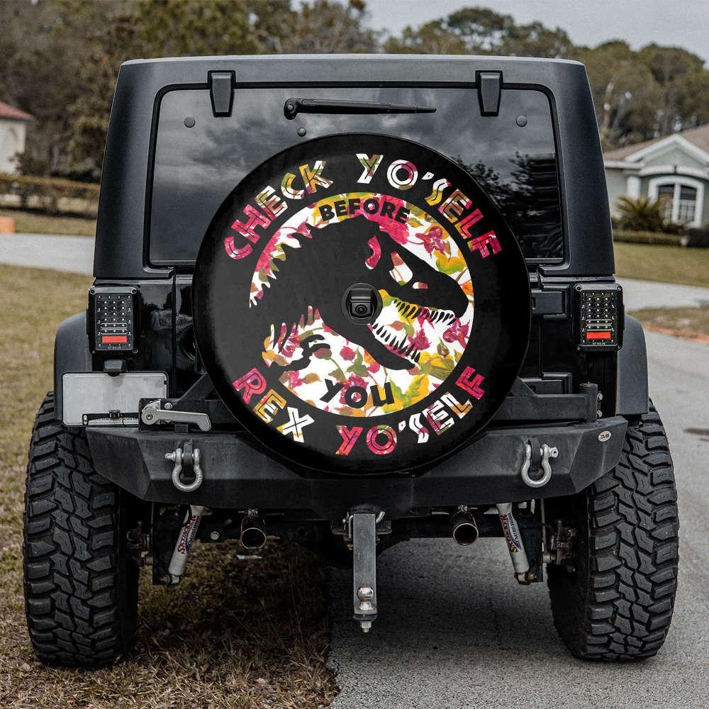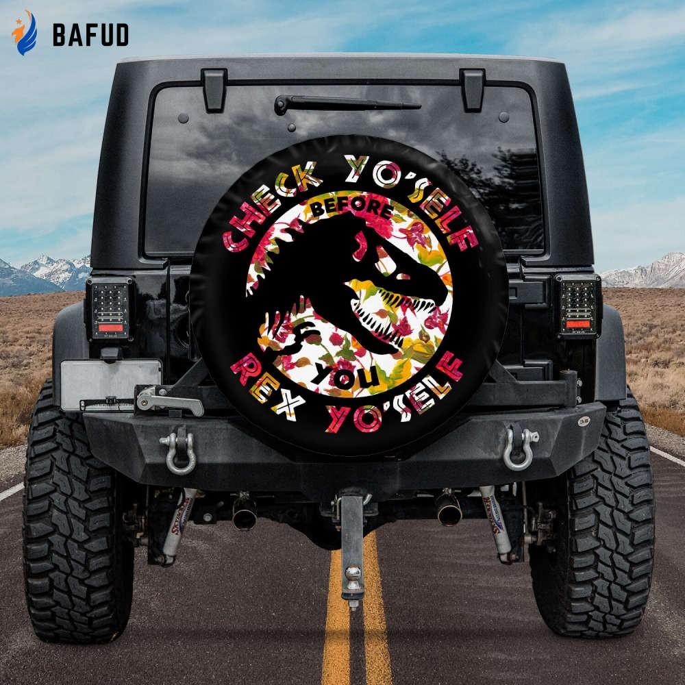 Not only does this tire cover offer practical benefits, but it also makes for a unique and thoughtful birthday gift for any dinosaur enthusiast. Surprise your loved ones with this one-of-a-kind accessory that combines style and functionality. Don't miss out on the opportunity to showcase your love for dinosaurs with the Check Yo’self Before You Rex Yo’self Spare Tire Cover. Order yours today and add a touch of flair to your vehicle while protecting your spare tire!