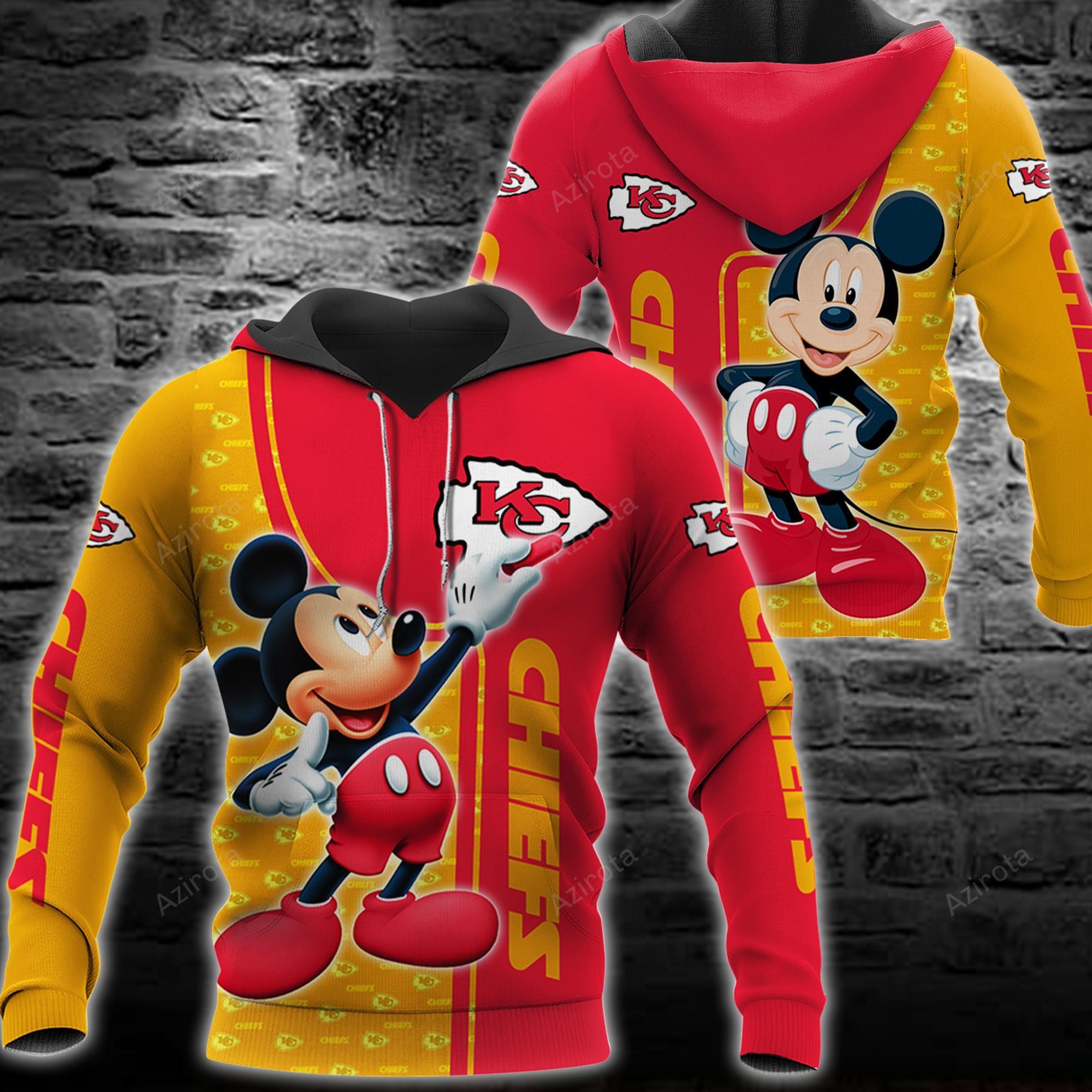 3D Full Printing Hoodie is the ultimate fan gear that combines the magic of Disney with the passion for football. This hoodie features a vibrant 3D print of Mickey Mouse in Chiefs colors, creating a unique and eye-catching design. Made from highquality materials, it offers comfort and durability. Perfect for both men and women, this hoodie is a great gift for any Chiefs fan. Show off your team spirit in style with this one-of-a-kind Mickey 3D shirt. Get yours now and be the envy of every fan!