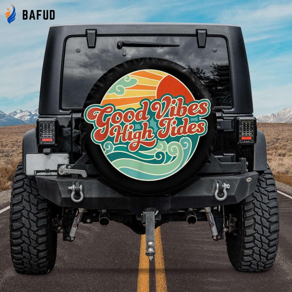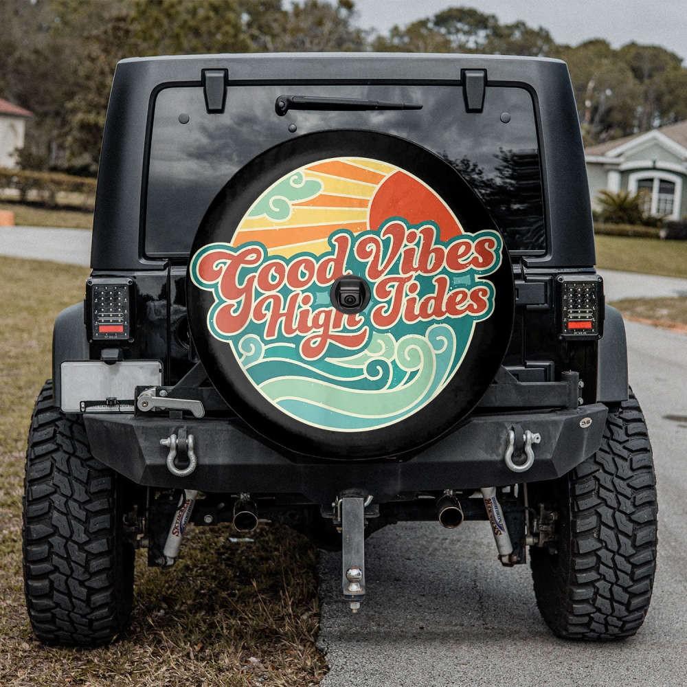 Upgrade your vehicle's style and protect your spare tire with our Good Vibes High Tides Spare Tire Cover. Experience the joy of surfing and the beauty of the beach every time you hit the road!