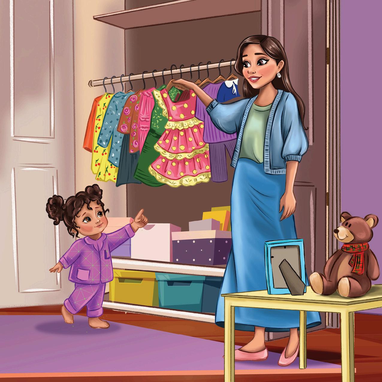 Two-year-oldLiais pointingatherbestoutfit inthecloset.