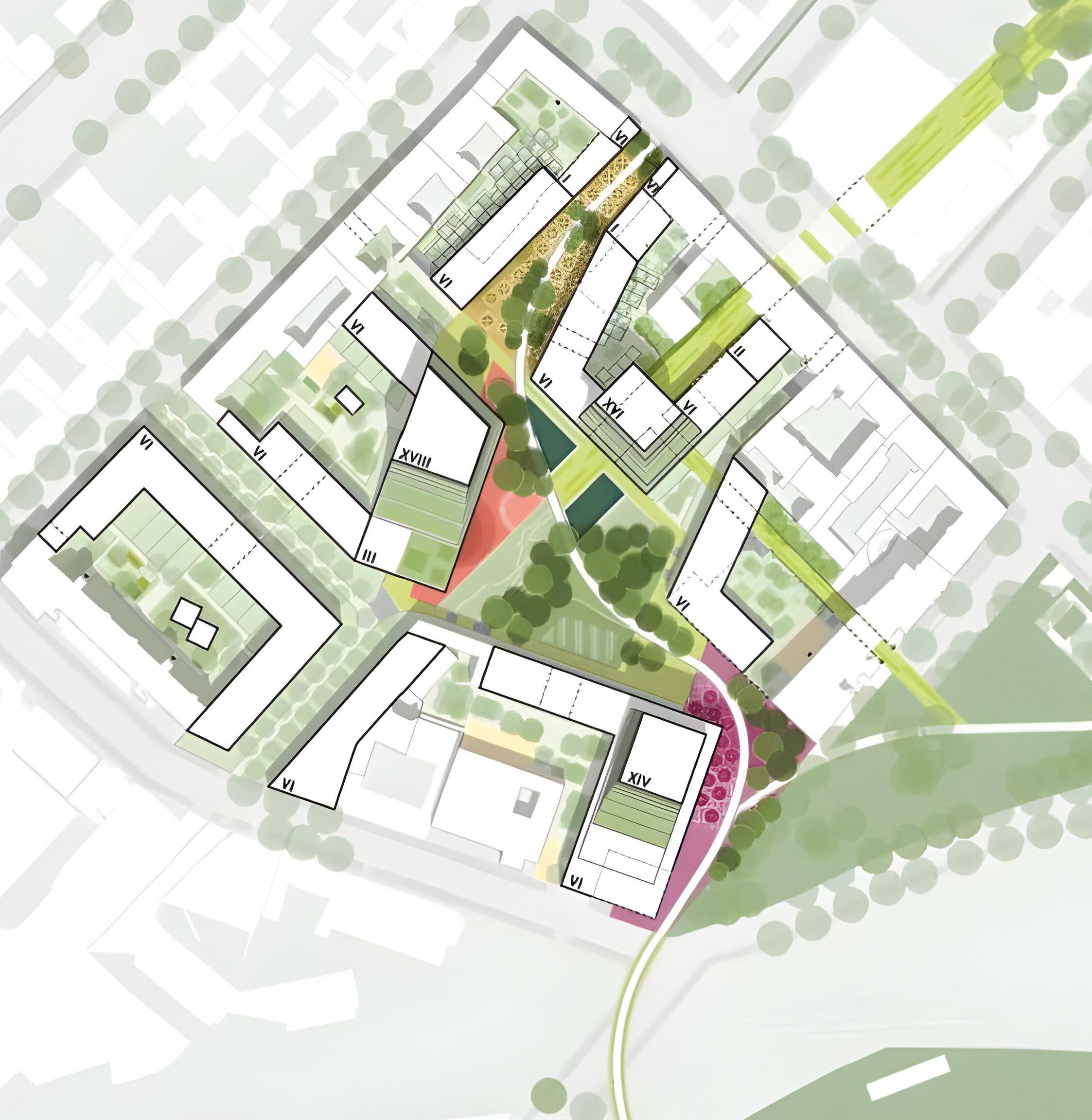 A concept to transform a campus into a green, sustainable, and so-cially cohesive environment should incorporate new buildings, renew existing structures, and create green corridors. A green network on ma-cro/micro scales will feature diverse vegetation, giving a local identity of „Sady Zoliborz,“ including creek wil-derness, urban parks, fruit gardens, and wild meadows. Water manage-ment strategies such as retention pools and rainwater reservoirs will enhance climate adaptation and biodiversity.