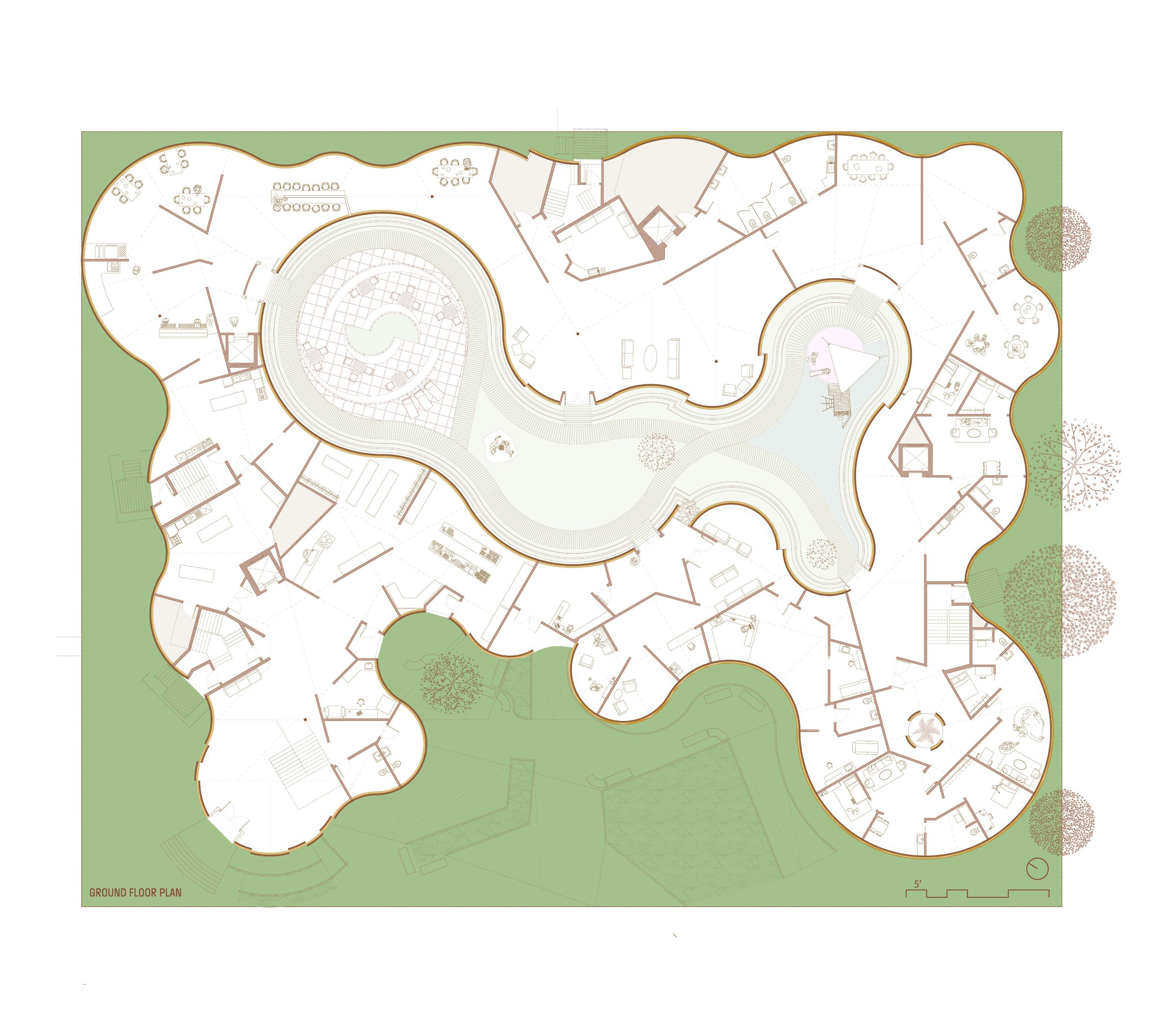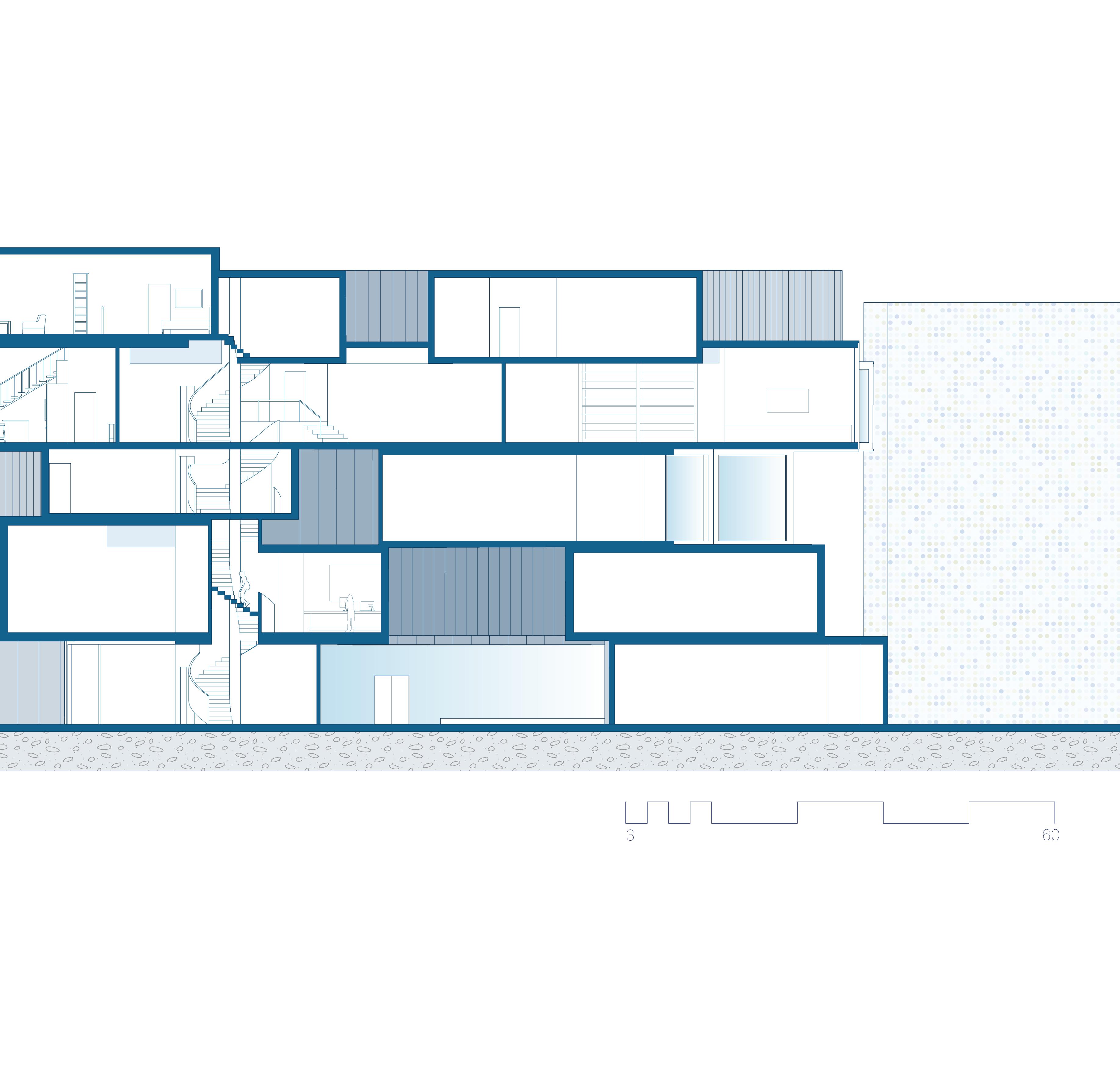Section Perspective. Cafeteria, housing units, and counseling