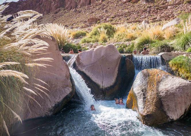 Relax in the Puritama Hot Springs, a series of eight natural pools nestled in a canyon 30 kilometers from San Pedro. Soak in thermal waters between 28°C and 31°C, rich in revitalizing minerals like calcium, magnesium and boron, surrounded by native vegetation and serene desert views.