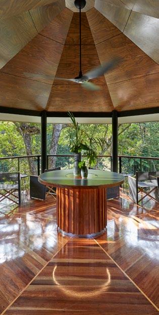 From the open-air reception – home to a convivial colony of decorative ceramic wildlife – guests are drawn into the cavernous spaces of the main lodge, an astonishing belvedere comprising the Treehouse Restaurant, lounge, bar and the well-named Jungle Perch, a comfortable hide for enjoying evening sundowners while birds and butterflies perform flash mob style among the treetops.