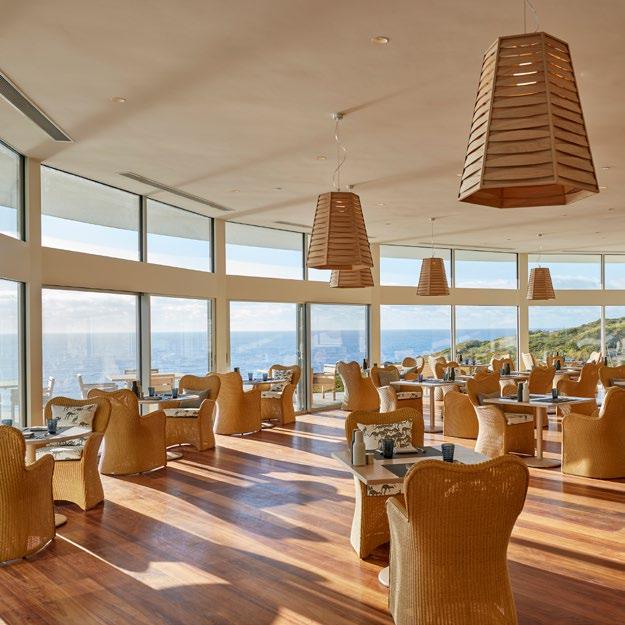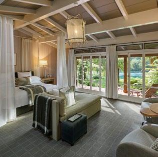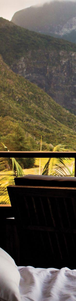 A contemporary architectural design presents generous indoor-outdoor lounging areas and a light-filled, expansive bar and restaurant, with ceiling-high glass that opens beneath a dramatic skillion roof seeming to reach to the mountain peaks beyond. Outside, Gowers Terrace offers luxurious lounging with a view, ideal for relaxing or enjoying sunset drinks, while a horizon pool invites a languid dip. Inside, a feeling of relaxed sophistication flows throughout. Beach house style furnishings and custom fabrics complement island-inspired artworks and recycled wooden floors to create an easy ambience.