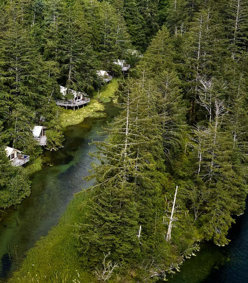 Clayoquot Wilderness Lodge sits amongst the lush coastal rainforest of remote Vancouver Island in British Columbia, Canada. Surrounded by the UNESCO listed Clayoquot Sound Biosphere, and flanking the pristine Strathcona Provincial Park, the 600 acre property sits at the head of the Bedwell River making it an ideal location to explore the wilds of the Island. Inaccessible by car, the lodge is reached by a 45 minute seaplane flight from Vancouver, or 35 minute boat ride from Tofino.
