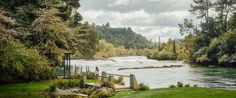 The ever-changing Waikato River and broader Lake TaupÅ region provide a magnificent natural setting for Huka Lodge. TaupÅ is found on the central plateau of New Zealandās North Island, distinguished by its vast lake and endowed with a gentle climate, a leisurely pace and spectacular landscape. Formed from an ancient volcanic caldera, Lake TaupÅās vast waters spill into the thundering Huka Falls. Snow-capped mountain peaks, rolling pastures of golden grasses, lush green wilderness and the clear waters of lakes, rivers and streams offer a calming and rewarding vista from every turn.