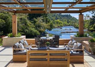 The expansive north facing terrace stylishly transitions between the indoors and out. A feature outdoor fireplace and contemporary glass roofed pergolas create a sumptuous outdoor lounging space for guests and a seamless connection with the chequered green lawns which run to the banks of the Waikato River.