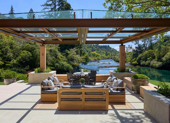 The expansive north facing terrace stylishly transitions between the indoors and out. A feature outdoor fireplace and contemporary glass roofed pergolas create a sumptuous outdoor lounging space for guests and a seamless connection with the chequered green lawns which run to the banks of the Waikato River.