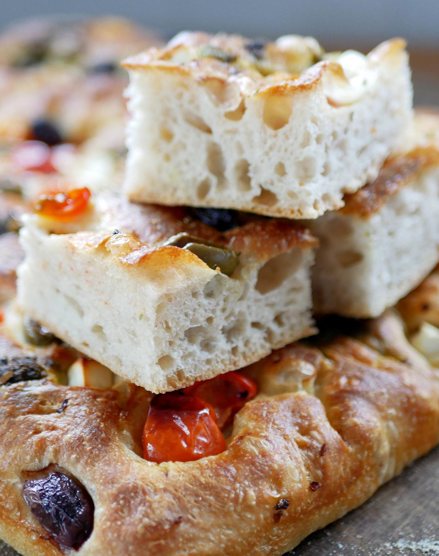Press the dough with your fingers and add preferred seasoning, e.g. olives, tomatoes and herbs.