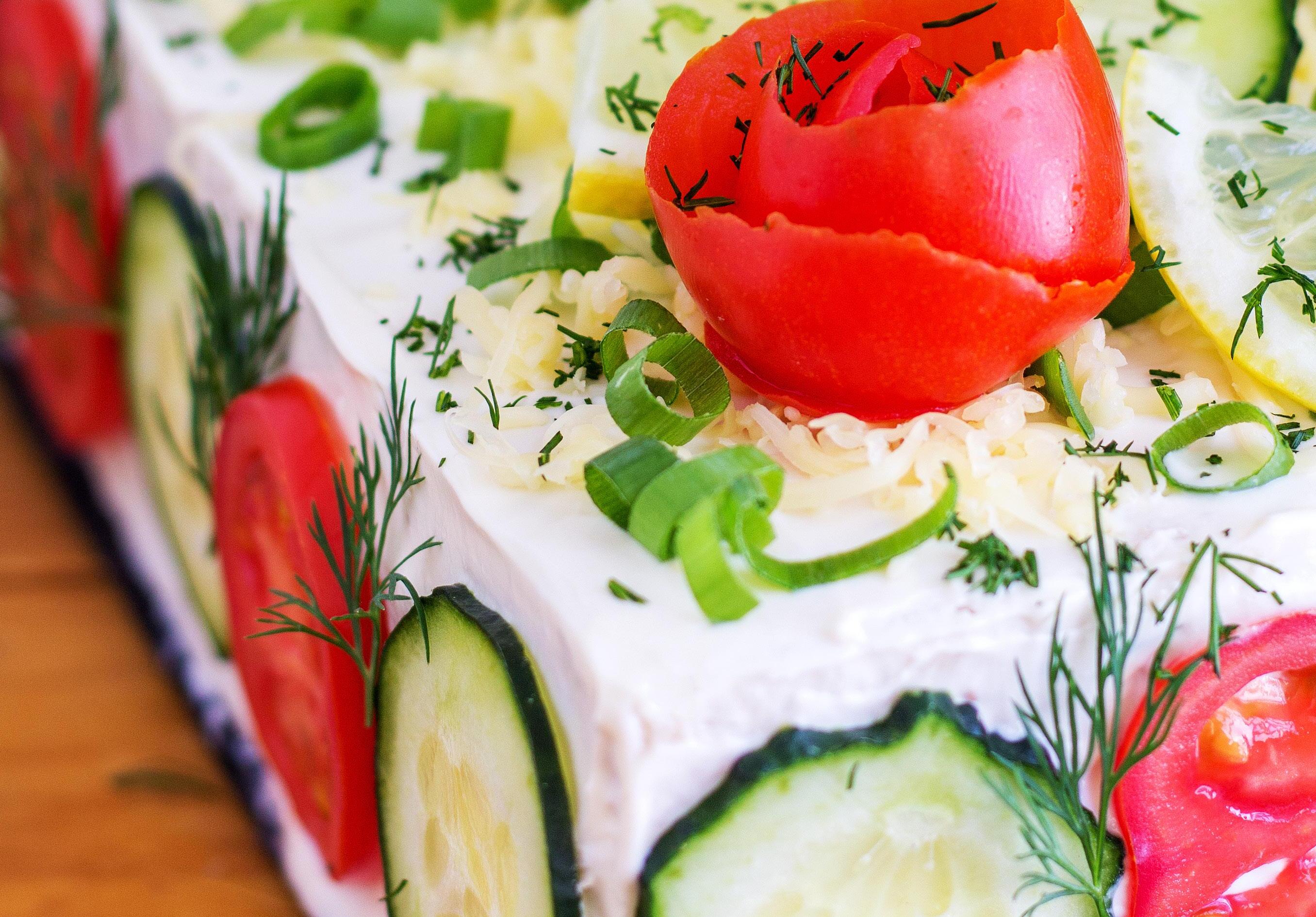Fill the layers with a savory filling of your choice and decorate with cream cheese and vegetables.