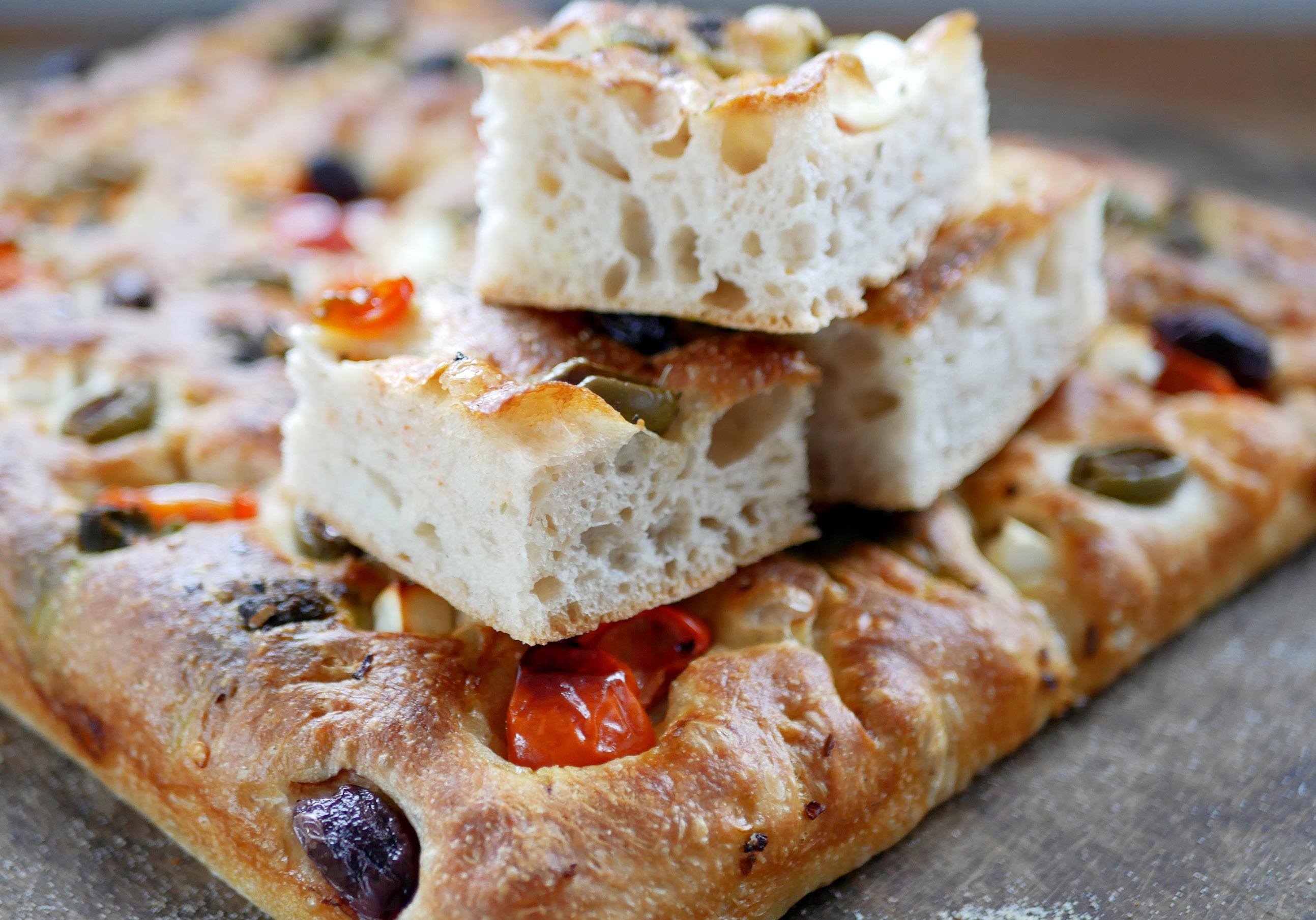 Kavla degen 3 mm tjock och dela i 2 delar. Pensla med vatten, lägg på oliver, tomater och fetaost. Lägg på nästa kavlade deg. Skär ut i önskade storlekar och låt jäsa i 40 minuter i rumstemperatur.