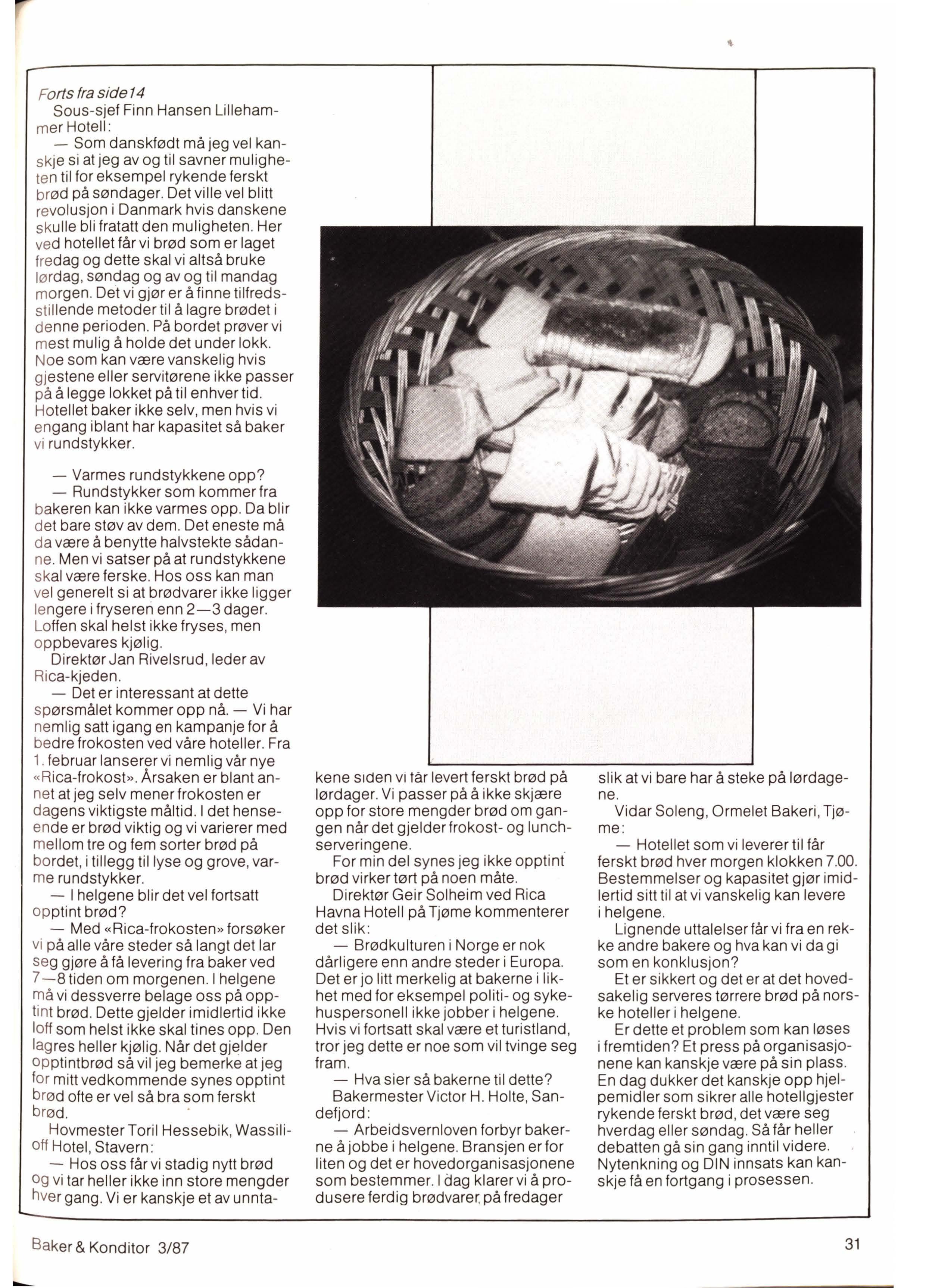 - Det er interessant at dette sp ørsmålet kommer opp nå . - Vi har ne mlig satt igang en kampanje for å be dre frokosten ved våre hoteller Fra 1. februar lanserer vi nemlig vår nye «Ri ca -frokost ». Årsaken er blant anne t at jeg selv mener frokosten er dagens viktigste måltid I det henseen de er brød viktig og vi varierer med m e llom tre og fem sorter brød på bo rdet , i tillegg til lyse og grove , varme rundstykker