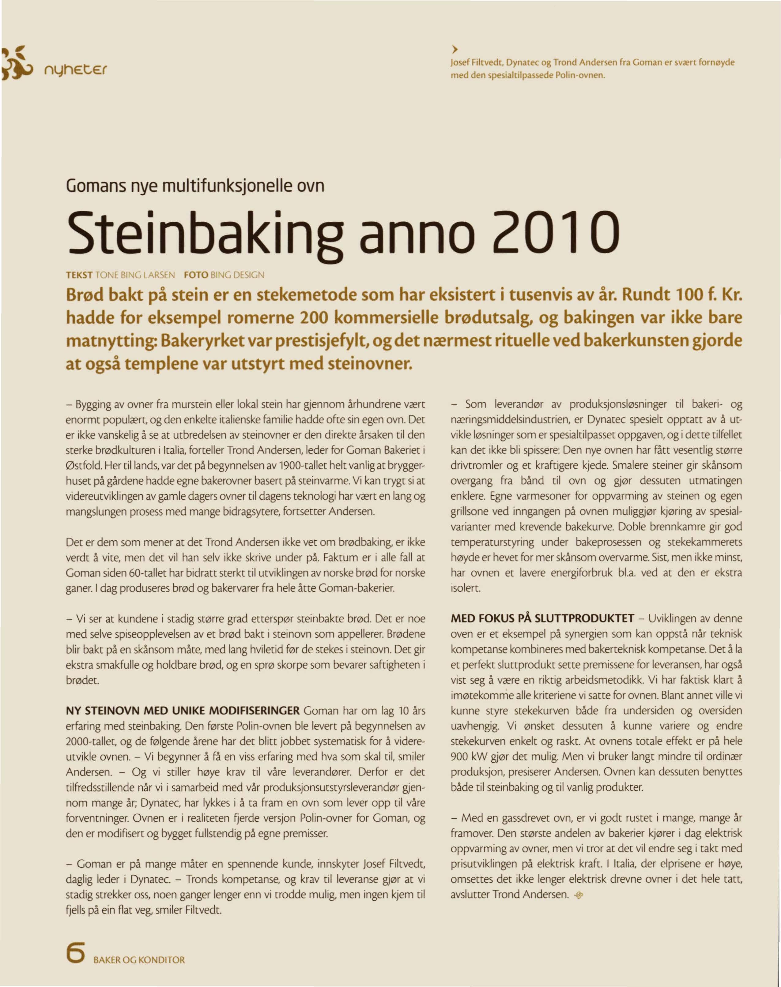- Bygging av ovner fra mursrein eller lokal srein har gjennom århundrene værr enorme populære, og den enkelre iralienske familie hadde ofre sin egen ovn Der er ikke vanskelig å se ar urbredelsen av sreinovner er den direkre årsaken ril den srerke brødkulruren i lralia, forreller Trond Andersen , leder for Goman Bakerier i Øsrfold. Her ril lands, var der på begynnelsen av 1900-raller helr vanlig ar bryggerhuser på gårdene hadde egne bakerovner basere på sreinvarme. Vi kan trygt si at videreurviklingen av gamle dagers ovner til dagens teknologi har vært en lang og mangslungen prosess med mange bidragsytere, fortsetter Andersen.
