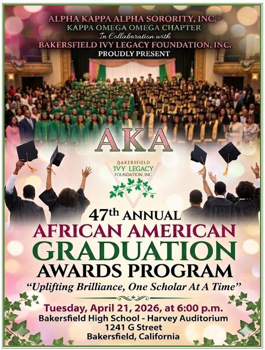Since 1979, Kappa Omega Omega Chapter of Alpha Kappa Alpha Sorority, Inc., (AKA) has sponsored an Annual African American Graduation Awards Program. This program is a celebration of outstanding African American High School and honor roll Eighth-Grade students in Kern County. High School graduates receive scholarships and Eighth-Grade graduates are presented with Certificates of Recognition.
