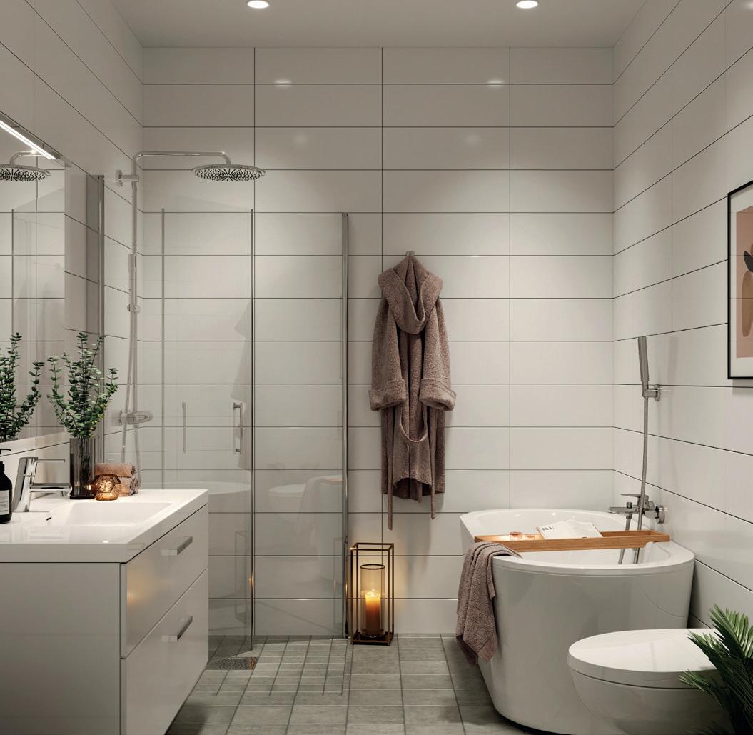 Flislagte bad med moderne baderomsmøbler.