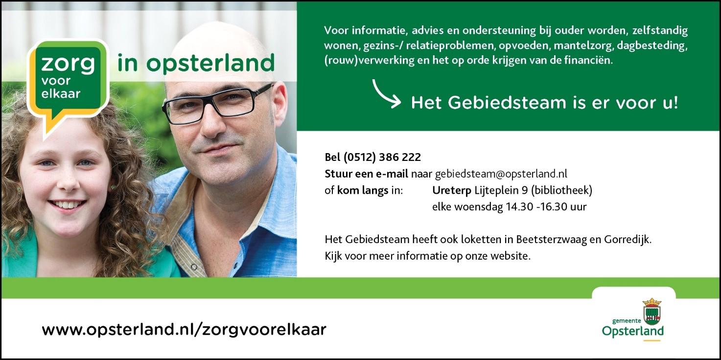 Voor advies en ondersteuning bij opvoeden en opgroeien, naar school gaan, leven met een beperking, ouders worden en zelfstandig blijven wonen, maatschappelijk werk en budgetadvies kunt u bij het Gebiedsteam terecht: (0512) 386 222 (ma-vr. 09.00 – 12.30 uur) of gebiedsteam@opsterland.nl