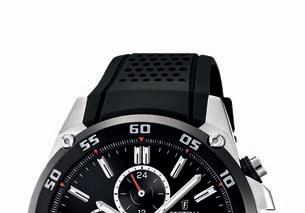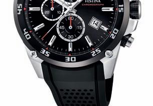 Festina gent’s chronograph. Solid XXL 47 mm Stainless steel case and black silicon strap. Black dial with silver applied luminous index. Chronometer & date functions. 10 bar water-resistant.