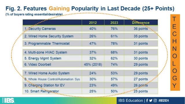 Technology is the common thread through all the features gaining the most favor with buyers in the last 10 years. Figure 2 also allows us to glean that buyers are leaning on technology primarily for two purposes: to increase the safety of their home and to save energy by efficiently controlling the temperature of their home.