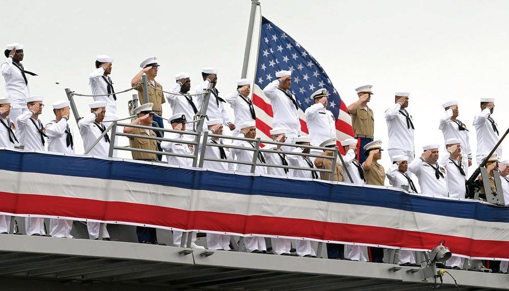 Welcomed throughout the week, the crew, joined by the ship’s sponsor, Shana McCool, and McCool’s great-grandchildren, attended community events supported by local businesses, flyovers by the Navy’s Blue Angels flight demonstration squadron, a visit by the Pensacola Blue Wahoos, and ceremony host, Naval Air Station Pensacola.