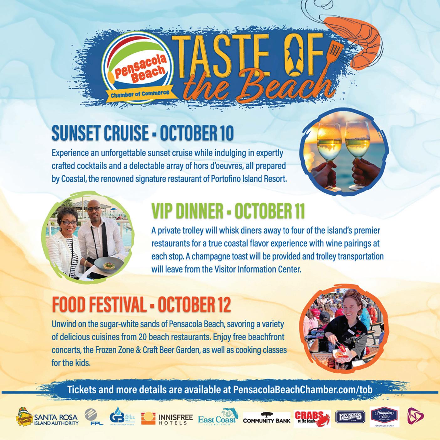 Pensacola Beach’s Taste of the Beach Festival will take place from 10 am to 5 pm on October 12. The festival features a variety of Pensacola Beach restaurants showcasing and serving up their signature dishes to attendees. There will also be cooking demonstrations, live entertainment, children’s activities and more. Entry to the festival is free. 2024’s Taste of the Beach Festival will be hosted at the Casino Beach Gulfside Pavilion. For more information, visit pensacolabeachchamber.com.