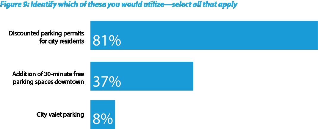 • Parking & Transportation: 81% of residents indicated they would take advantage of a discounted parking permit for city residents. 88% said they would prefer building a new parking garage through parking revenues instead of going out to bond such a project.